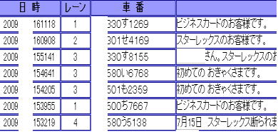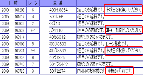 ・各SSをディスプレイ上で一元管理。(1SS所有の場合はひとつだけ表示されます) ・前月、当月、前日、当日、一時間当りの来店台数を 表示。比較するのも一目瞭然。 ・SSの画像をクリックすると、見たいSSを拡大、 下部には、音声指示の内容を表示します。 設置当日はアリスMのデータベースに登録がないので、来店車両全部が初めてのお客様になります。 スタッフは、会員(系列カード客)かどうかをチェック、アリスMに入力します。じっくり取り組みましょう。 ![]() 設置から数日後にはこのようになってきます。 おっ!自社発券カードのお客様の来店です。入力がちゃんとできてますね。 ![]() リピーターのお客様が増えてきました。 (例題のここは、スプリット方式・カード会員制ではありません) 車検月の取得指示は、2回目の来店時より出ます。車検月を取得したお客様には何も出ません。 車検月を取得していない車両はどうなりましたか?取得できましたか? 車検6ヶ月前の車両も来店しています。アプローチは? ![]() 一度、車検満了日を取得した車両には『車検日を取得してください』の指示はありません。 取得した日にちにより、自動的に『車検6ヶ月前です』などの音声連絡を受けることができます。 『車検日を取得してください』の指示の出る車両は、取得後は日に日に少なくなります。 設置から数ヶ月後にはこんな感じです。所持カードの区別や車検月の取得ができてきます。 初めてのお客様が来店したら、固定化のチャンス!逃したらもったいないですヨ。 心を込めて丁寧に接客しましょう。機器の使い方を説明したり、系列クレカ等をお勧めします。 一日に数台しか来店しない初めてのお客様を見分けられるのもアリスMの強みです。 ![]() ※音声指示により、オイル交換、コーティング、タイヤ、バッテリー販売など、SSの油外販売すべての 並行利用が可能です。