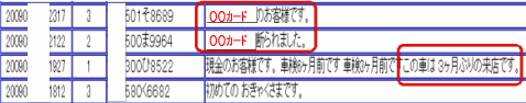 ・各SSをディスプレイ上で一元管理。(1SS所有の場合はひとつだけ表示されます) ・前月、当月、前日、当日、一時間当りの来店台数を 表示。比較するのも一目瞭然。 ・SSの画像をクリックすると、見たいSSを拡大、 下部には、音声指示の内容を表示します。 設置当日はアリスMのデータベースに登録がないので、来店車両全部が初めてのお客様になります。 スタッフは、会員(系列カード客)かどうかをチェック、アリスMに入力します。じっくり取り組みましょう。 ![]() 設置から数日後にはこのようになってきます。 おっ!自社発券カードのお客様の来店です。入力がちゃんとできてますね。 ![]() リピーターのお客様が増えてきました。 (例題のここは、スプリット方式・カード会員制ではありません) 車検月の取得指示は、2回目の来店時より出ます。車検月を取得したお客様には何も出ません。 車検月を取得していない車両はどうなりましたか?取得できましたか? 車検6ヶ月前の車両も来店しています。アプローチは? ![]() 一度、車検満了日を取得した車両には『車検日を取得してください』の指示はありません。 取得した日にちにより、自動的に『車検6ヶ月前です』などの音声連絡を受けることができます。 『車検日を取得してください』の指示の出る車両は、取得後は日に日に少なくなります。 設置から数ヶ月後にはこんな感じです。所持カードの区別や車検月の取得ができてきます。 初めてのお客様が来店したら、固定化のチャンス!逃したらもったいないですヨ。 心を込めて丁寧に接客しましょう。機器の使い方を説明したり、系列クレカ等をお勧めします。 一日に数台しか来店しない初めてのお客様を見分けられるのもアリスMの強みです。 ![]() ※音声指示により、オイル交換、コーティング、タイヤ、バッテリー販売など、SSの油外販売すべての 並行利用が可能です。